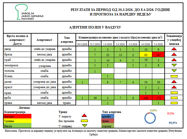 Za ovu sedmicu prognozirano je smanjenje koncentracija polena čempresa i topola, ali zato će u porastu biti poleni javora, breza, graba, jasena i hrasta, dok će ostale vrste stagnirati.