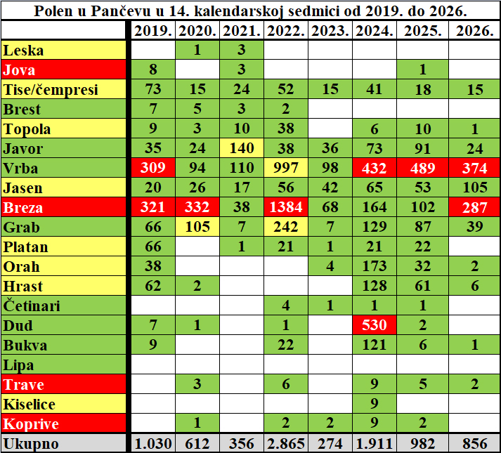 Što se tiče dva drveta, breze i vrbe, koja su se posebno rascvetala u 14. sedmici ove 2026. godine, pregled i u prethodnim sezonama pokazuje da period njihove polinacije nije mnogo različit. Sve ipak zavisi od konkretnih vremenskih uslova u pojedinim danima – da li ima kiše, vetra, da li sija sunce, kakvo je vreme prethodilo i slično. Crvena i žuta boja u ovoj tabeli označavaju da li je u toku 14. sedmice bilo dana kada su vrednosti prelazile granicu srednjih ili visokih koncentracija.