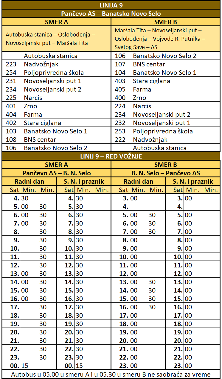 Prvi i poslednji polasci i iz Pančeva i iz Banatskog Novog Sela važe i za vikend i za praznike, ali u toku celog dana autobusi saobraćaju na sat vremena.