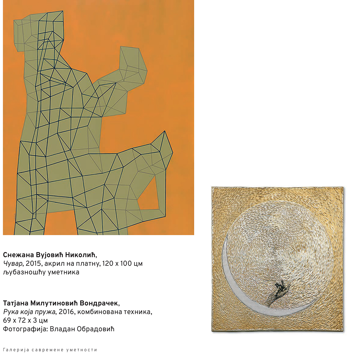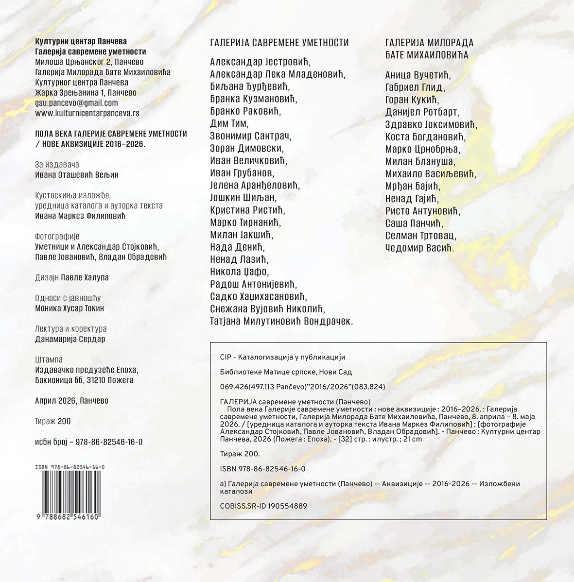 – Ova izložba je i jedna vrsta apela ka Republici Srbije jer već dve godine ne postoje konkursi preko kojih smo većinu radova i dobili. Bitno je to i za nas a i za egzistenciju autora. Galerija je u svih proteklih 50 godina otkupljivala radove umetnika i obogaćivala na taj način svoj fond kako bi ostavili nešto generacijama koje dolaze, kao svedočanstvo perioda u kojima su umetnici stvarali. U pitanju su autori koji su sa nama sarađivali kroz različite projekte, što kolektivne što samostalne izložbe, tako da je ovo način da se i njima zahvalimo. Želim da se zahvalim i tehničkom timu koji je zaslužan što sve ovako lepo izgleda, pošto na njih uvek zaboravimo – rekla je Ivana Markez Filipović, kustoskinja izložbe i urednica vizuelnih umetnosti u Kulturnom centru Pančeva.