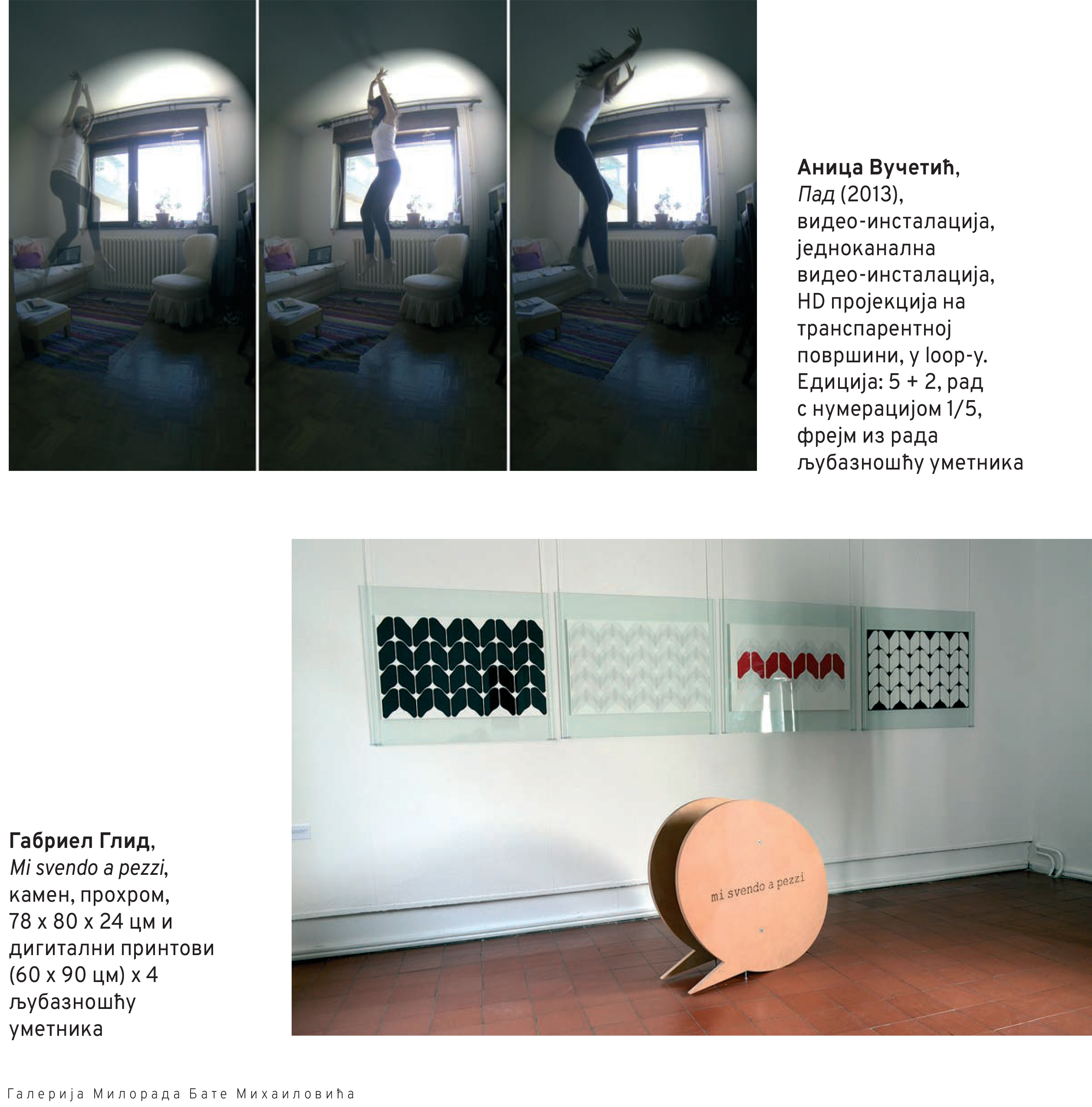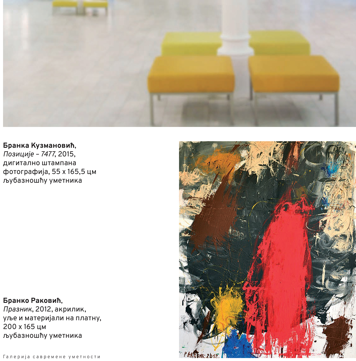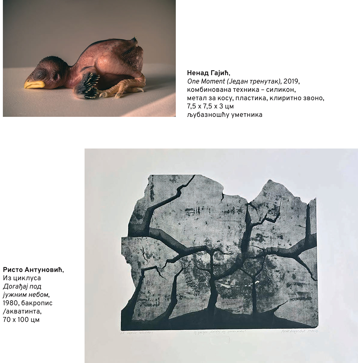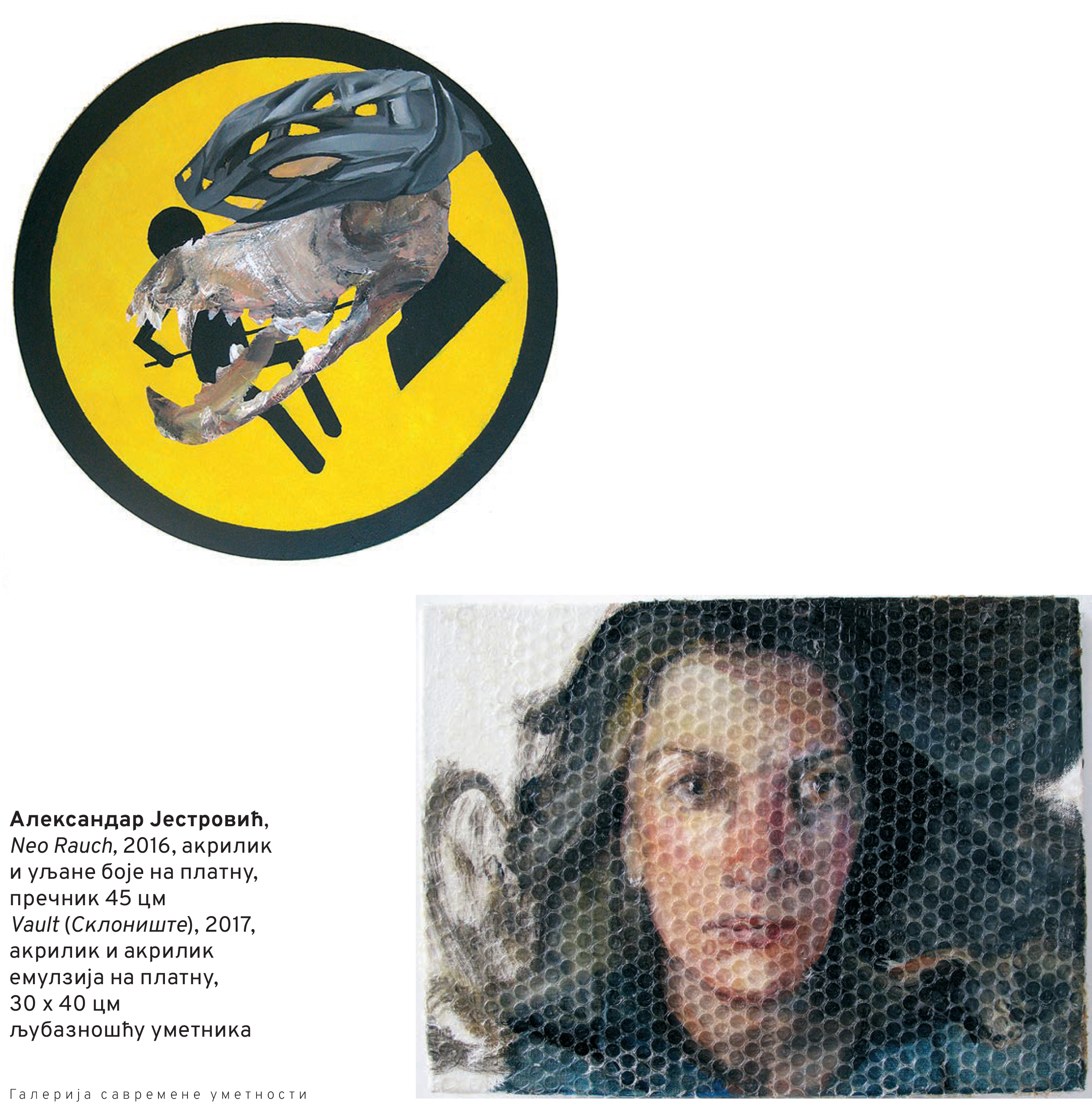 Oko 50 slika, grafika, skulptura, instalacija, fotografija biće izloženo do 8. maja i u Galeriji savremene umetnosti i u Galeriji Milorada Bate Mihailovića, gde je sinoć priređen i prvi deo otvaranja.