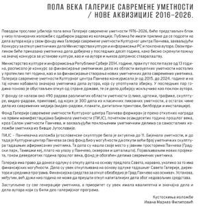 „Nove akvizicije 2016–2026”, izložba koja je sinoć otvorena u čast 50 godina postojanja Galerije savremene umetnosti, otkrila nam je na neki način radove 37 umetnika – većina nije često viđana a neka čak nisu do sada ni bila izlagana. Reč je o delima do kojih je Galerija savremene umetnosti došla ili putem kupovine ili putem poklona u prethodnoj deceniji.