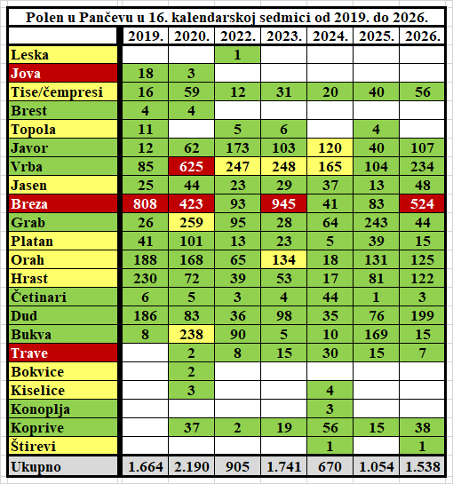 Poređenja koncentracija polena nad Pančevom pokazuju da je prošle godine breza u 16. kalendarskoj sedmici već bila u opadanju, a i da je ukupna količina polena svih alergenih biljaka, koje meri pančevački Zavod za javno zdravlje, bio daleko manji. Ipak, opšti okviri prisustva polena u ovo doba godine značajno se ne razlikuje. A pored breze i vrbe, ovo je period intenzivnijeg cvetanja i duda, oraha, hrasta i javora.