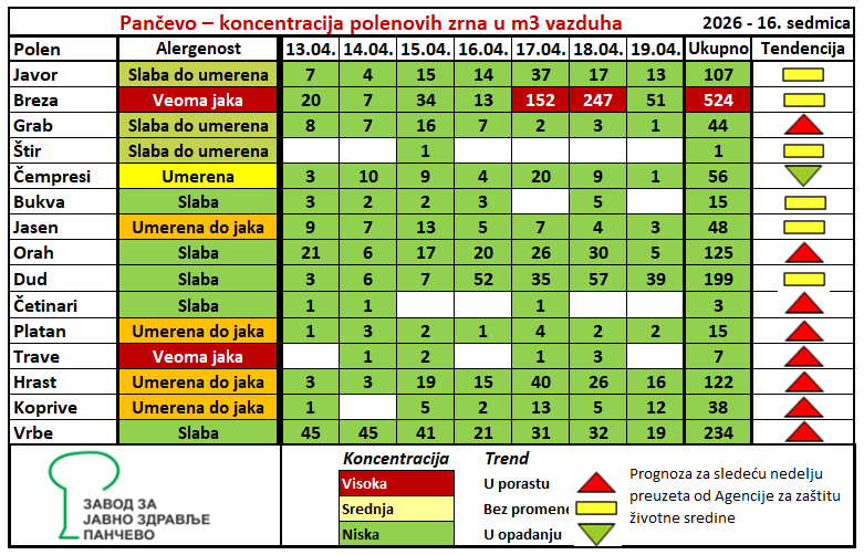 Za ovu sedmicu prognoziran je porast koncentracija polena graba, oraha, četinara, platana, trava i hrasta, kopriva i vrba, opadanje polena čempresa i stagnacija ostalih vrsta polena.