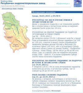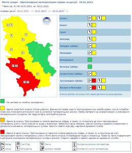 Zbog obilnih padavina na snazi je crveni meteo alarm, a RHMZ je izdao i upozorenja zbog velike količine kiše koja se očekuje, kao i zbog formiranja snežnog pokrivača.