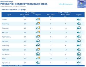 U petak, 20. januara, oblačno i hladnije sa kišom i snegom, dok se u subotu kiša očekuje uglavnom na istoku i severoistoku Srbije, a u ostalim krajevima sneg.