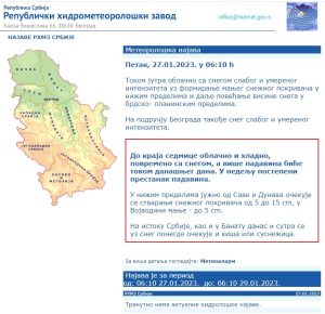 Tokom jutra oblačno sa snegom slabog i umerenog intenziteta uz formiranje manjeg snežnog pokrivača u nižim predelima i dalјe povećanje visine snega u brdsko-planinskim predelima.
