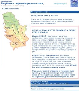 U subotu oblačno i vetrovito sa mešovitim padavinama, kišom i snegom. Više padavina će biti u istočnoj, centralnoj i jugoistočnoj Srbiji, od 10 do 30 mm za 24 h, dok se na planinama očekuje značajnije povećanje visine snežnog pokrivača od 15 do 30 cm, lokalno i više. Duvaće jak i olujni severozapadni vetar.