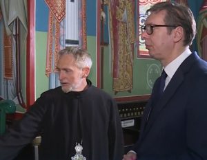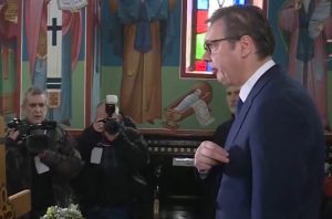 Pre nego što se obratio građanima u Kragujevcu predsednik je obišao crkvu, gde je po ulasku poljubio ikonu i zapalio sveću.
