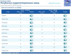 U većini krajeva Srbije, danas 28. februara, biće oblačno i pretežno suvo vreme. Uveče na jugozapadu, a postepeno i u ostalim predelima očekuje se kiša, a na planinama sneg.