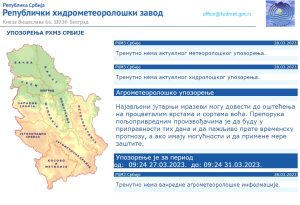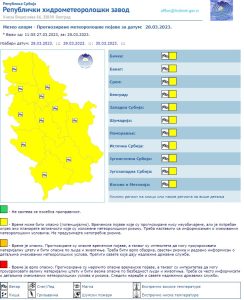 Udari vetra > 17 m/s, verovatnoća 95%, upozorio je RHMZ. U celoj zemlji je zbog pojačanog vetra na snazi je žuti meteo alarm, što znači da vreme može biti potencijalno opasno.