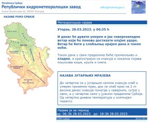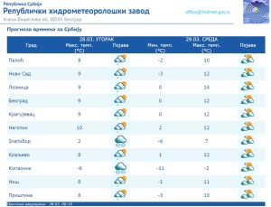 U sredu, 29. marta, biće promenljivo oblačno sa sunčanim intervalima, a slabe, kratkotrajne padavine su moguće na jugu Banata i na istoku zemlje. Duvaće slab i umeren vetar, na istoku povremeno i jak, severozapadni. Najviša dnevna temperatura biće oko 15 stepeni.