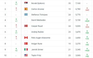 Novak trenutno ima 7.160 bodova, Alkaraz je izgubio u Majamiju 640 bodova i sada je na drugom mestu sa 6.780. Treći je Cicipas sa 5.770 bodova, a četvrti šampion Majamija Danil Medvedev sa 5.150.
