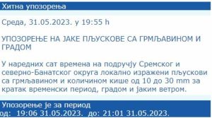 – U nastavku dana u većini krajeva kiša ili pljuskovi s grmljavinom, izraženijim na području Vojvodine, jugozapadne i južne Srbije (od 10 do 20 mm, lokalno i više), a ponegde može biti sugradice i grada.