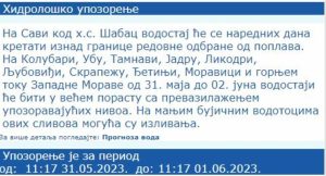 RHMZ je upozorila da možedoći i do izlivanja reka. „Na Savi kod h.s. Šabac vodostaj će se narednih dana kretati iznad granice redovne odbrane od poplava. Na Kolubari, Ubu, Tamnavi, Jadru, Likodri, Ljuboviđi, Skrapežu, Đetinji, Moravici i gornjem toku Zapadne Morave od 31. maja do 02. juna vodostaji će biti u većem porastu sa prevazilaženjem upozoravajućih nivoa. Na manjim bujičnim vodotocima ovih slivova moguća su izlivanja“, upozorava RHMZ.