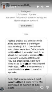 – Šta bi trebalo da kažem nakon ovoga? Treba da brinem za moj život, samo zato što sam izgubila nakon povrede? Sportisti daju sve najbolje na terenu i ovakve preteće poruke su nešto stvarno ozbiljno! Postavljam ovo po prvi put, zato što sam umorna od dobijanja ovakvih poruka čak i kada dobijam mečeve – Natalija Stevanović.